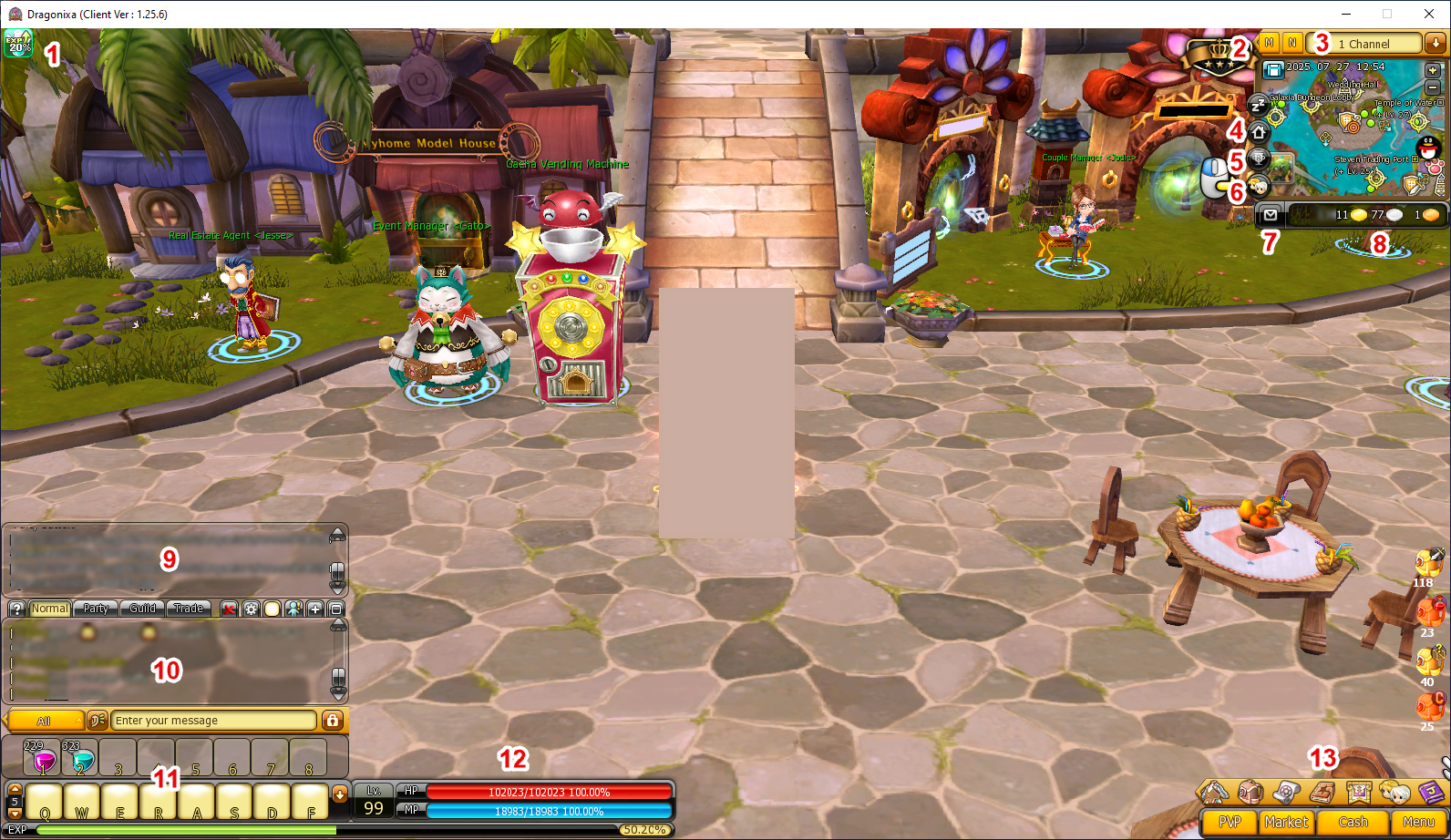 Menu Bar - เมนูต่าง ๆ 13.1 Character Info (U) - ข้อมูลผู้เล่น 13.2 Item Bag (I) - กระเป๋าสัมภาระ 13.3 Skill (K) - หน้าต่างสกิล 13.4 Quest Log (L) - หน้าต่างเควส 13.5 Guild (G) - หน้าต่างกิลด์ 13.6 Party (Y) - หน้าต่างปาร์ตี้ 13.7 Journal (J) - สมุดบันทึกการผจญภัย